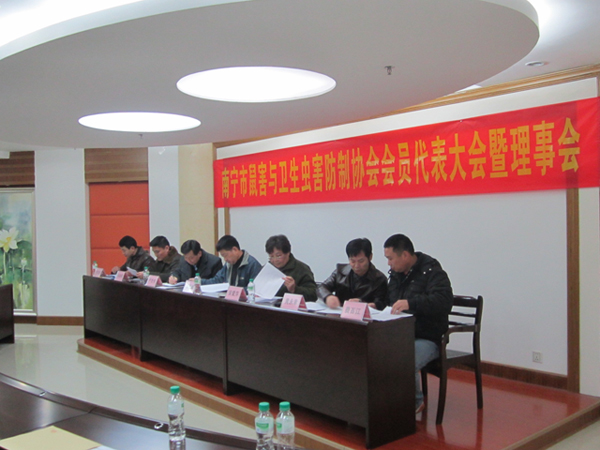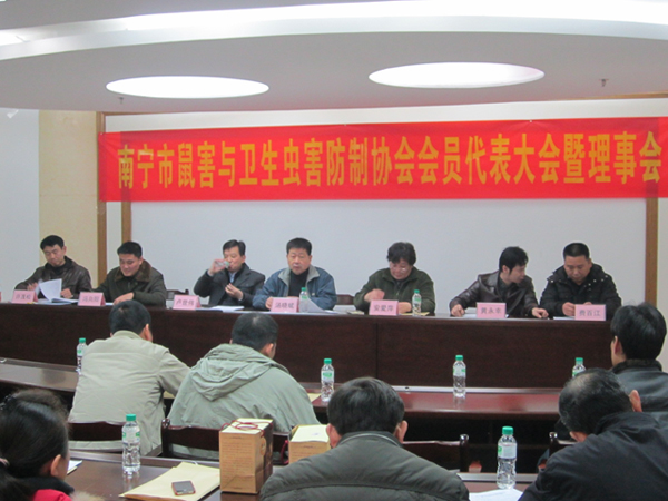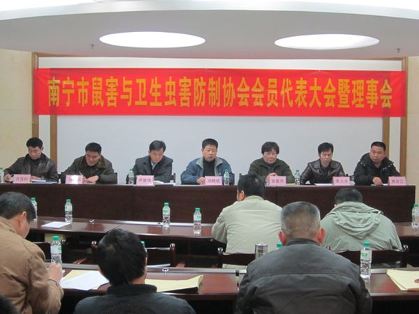 2012年元月9日,南寧市鼠害與衛(wèi)生蟲害防制協(xié)會在南寧市衛(wèi)生局召開了協(xié)會理事及全體會員大會,會議審議并全體通過了協(xié)會工作報告、財務(wù)報告及新一屆協(xié)會領(lǐng)導(dǎo)選舉??祪艄究偨?jīng)理黃永幸先生當(dāng)選新一屆協(xié)會副會長。圖為南寧市衛(wèi)生局長湯曉斌、愛衛(wèi)辦常務(wù)副主任盧世偉、安愛萍會長(原南寧市疾控中心黨委書記)、愛衛(wèi)辦副主任許茂松(協(xié)會副會長)、副會長馮向陽(廣西自治區(qū)疾控病媒專家)、副會長黃永幸、秘書長費(fèi)百江在主席臺就座。